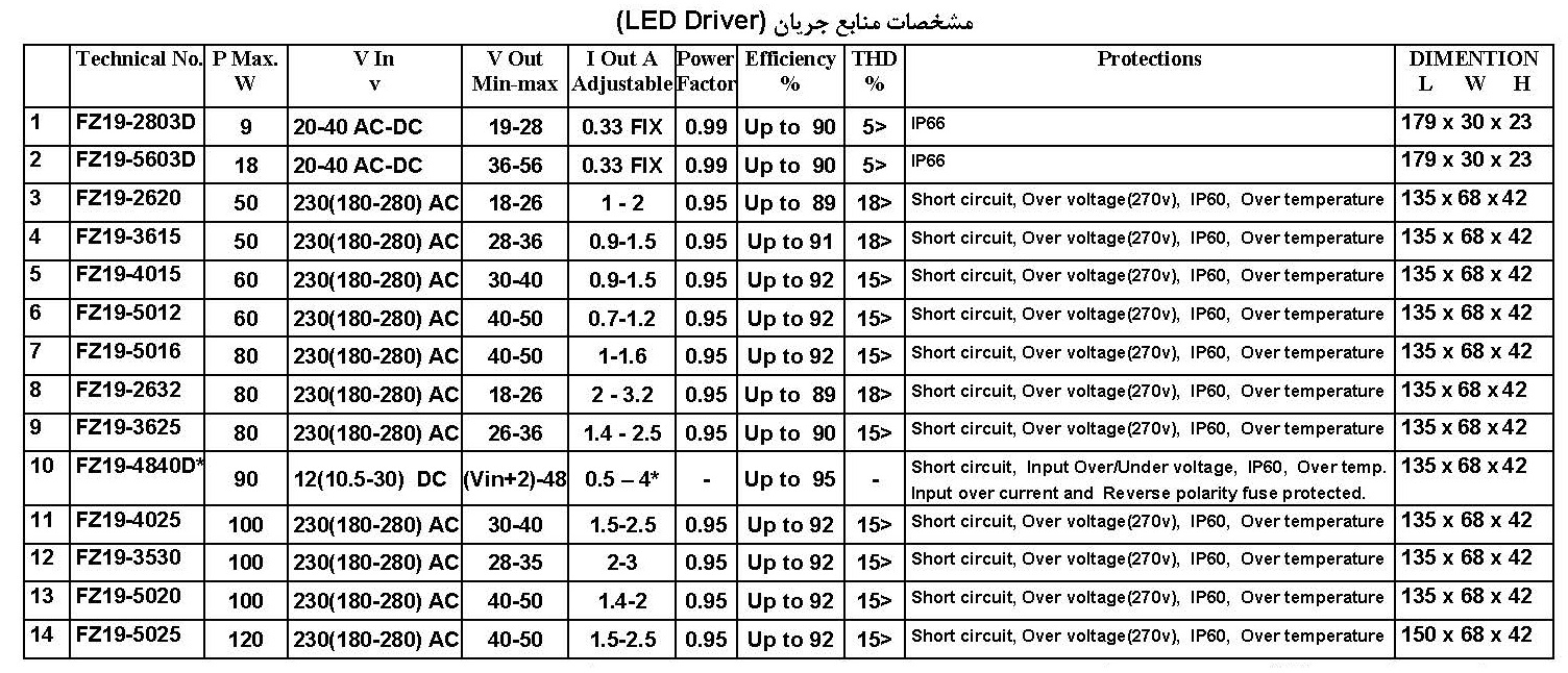 در جدول ذیل، لیست درایورهای تولیدی به همراه مشخصات الکتریکی و مکانیکی خدمتتان ارائه می شود.این درایورها برای تولید چراغ های ساخته شده با انواع LED مانند SMD ها ، تیپ پاورهای یک وات و COB ها کاربرد دارند.